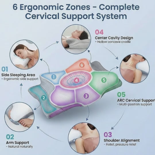Ergonomic Butterfly Design with 6 Support Zones Revolutionary hollow concave center with 6 distinct ergonomic zones: head support, ARC cervical area, cervical extension, shoulder support, and arm support areas. Adapts seamlessly through all sleep positions — zero pressure points, constant cervical decompression all night.